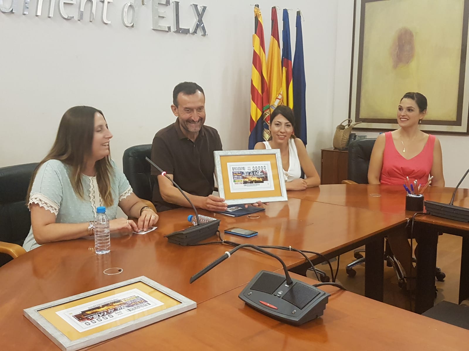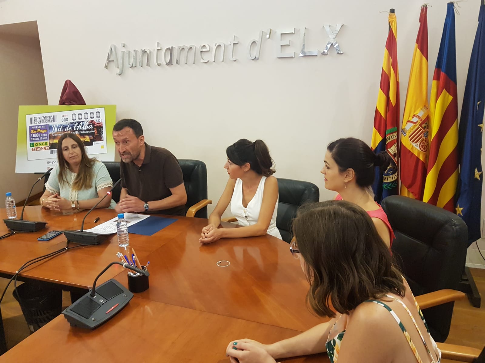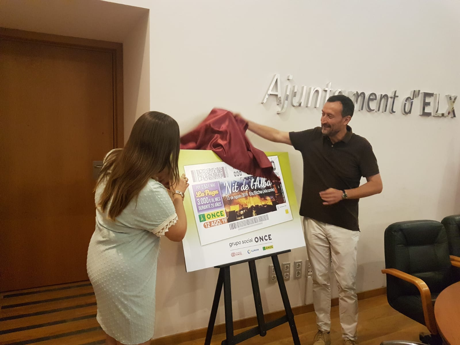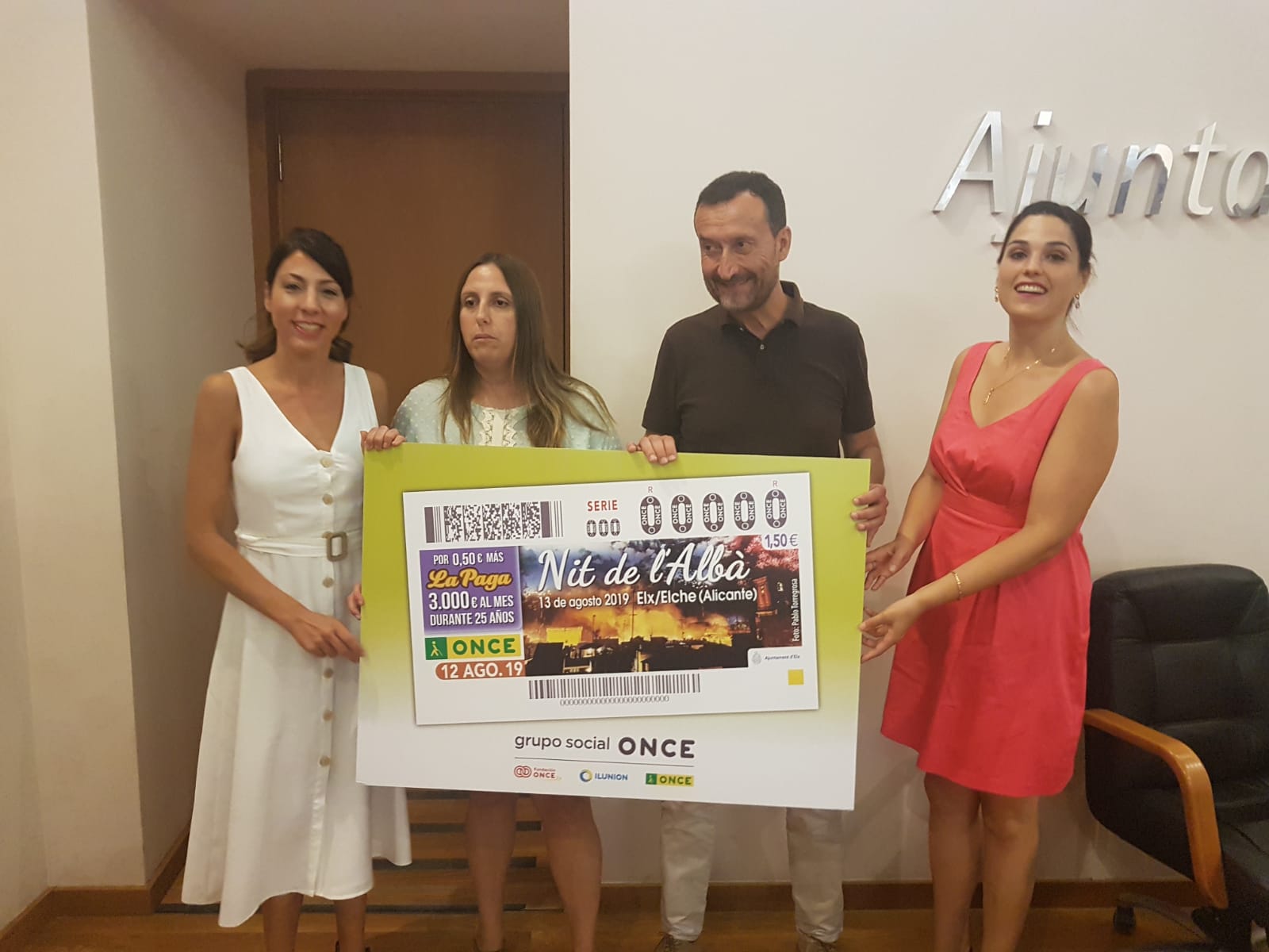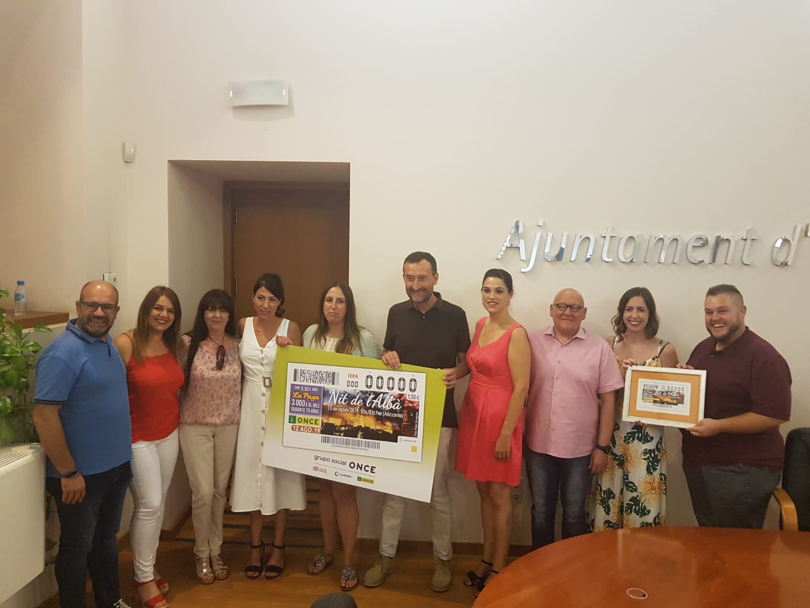 La Nit de l’Albà saldrá impresa en los más de cinco millones de cupones que la ONCE distribuirá para el sorteo del próximo martes 13 de agosto, difundiéndose así una de las festividades más tradicionales de Elche por toda la geografía española. El alcalde, Carlos González, junto a la directora provincial de la Organización, Estela Medina, han presentado el boleto esta mañana en la Sala del Consell, acompañados por miembros del Equipo de Gobierno y responsables de la entidad.