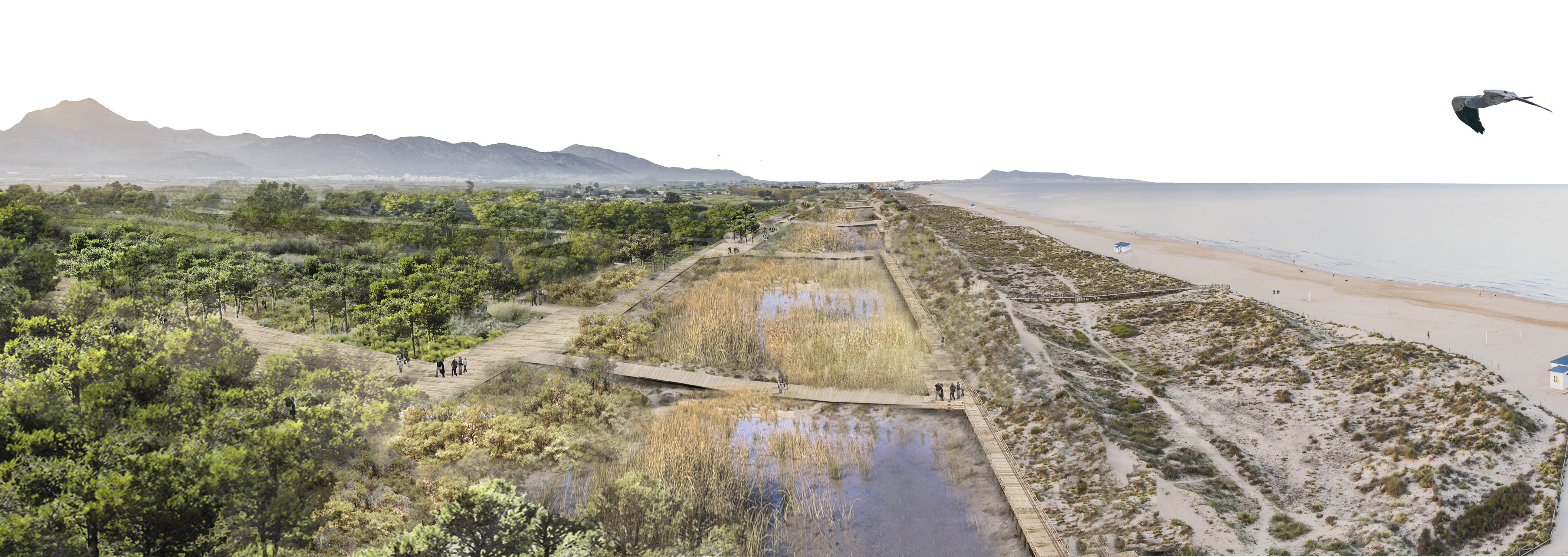 En el primer caso, la propuesta estudia la reconversión integral de la carretera de acceso al Palmar, transformándolos en un itinerario compatible para ciclistas y peatones, la extensión de la Reserva Natural del Racó de l’Olla, y la regeneración de las zonas agrícolas degradadas y su conexión con los sistemas hídricos.