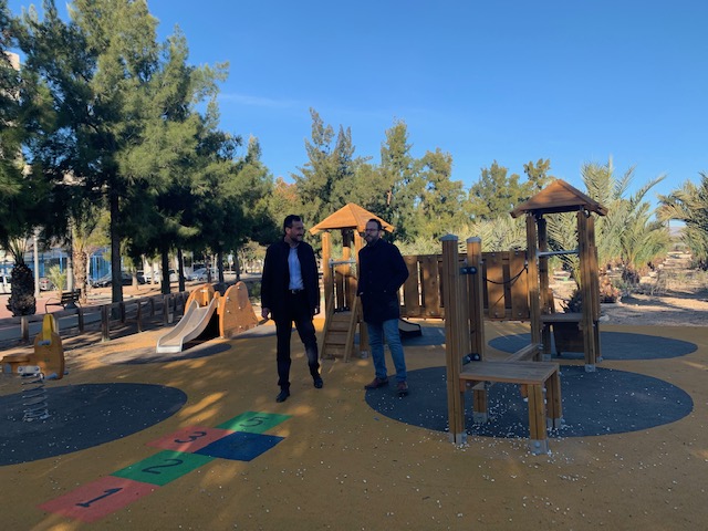 El alcalde de Elche, Carlos González, y el concejal de Modernización del Espacio Público, Héctor Díez, han visitado esta mañana el Jardín de los Niños y las Niñas del barrio de la Universidad donde el Ayuntamiento ha creado una nueva zona de juegos infantiles y está procediendo a la poda de palmeras de la zona.
