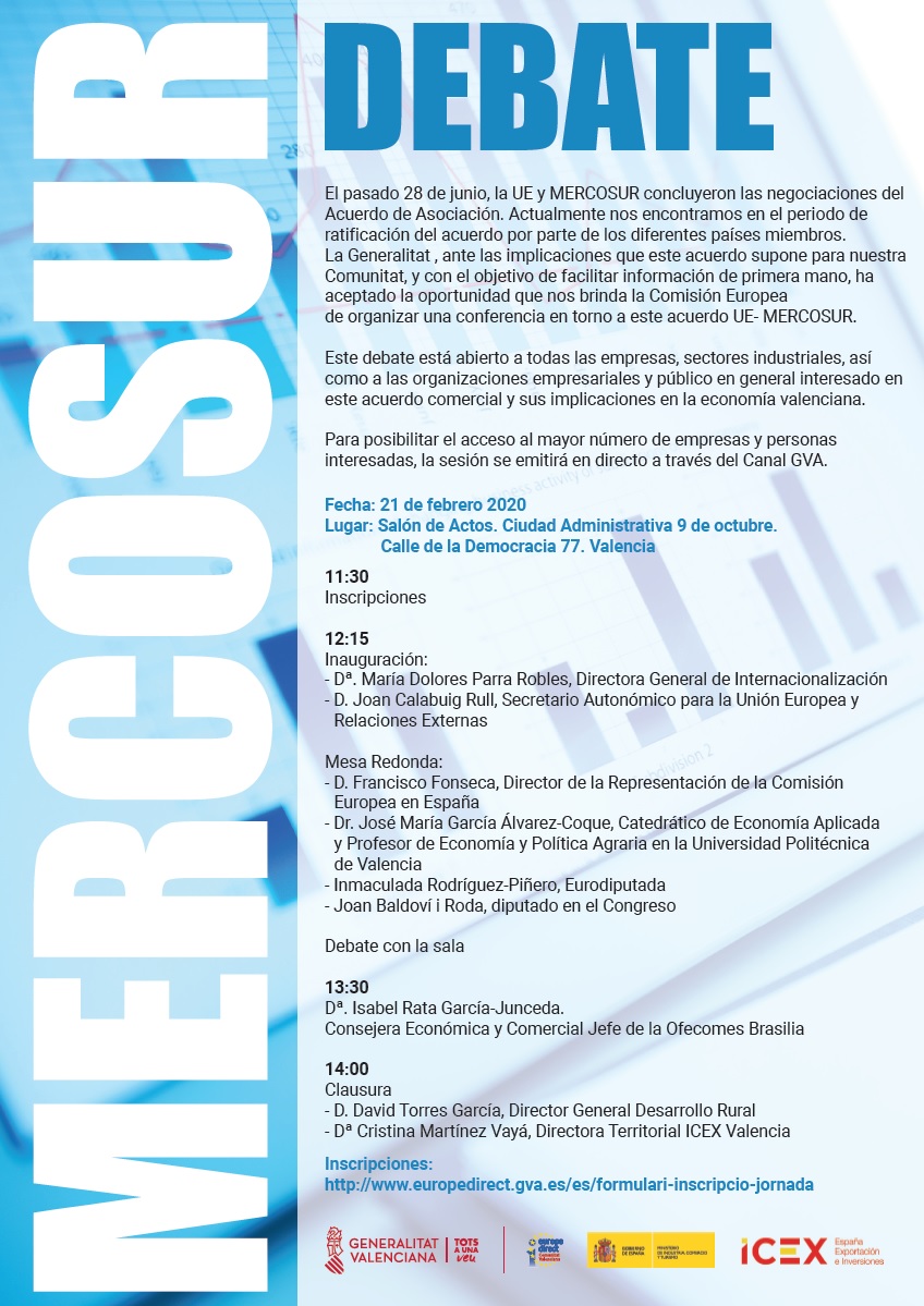 La Generalitat ha organizado un debate en torno al acuerdo entre la Unión Europea y Mercosur, que implica la integración de un mercado de 800 millones de habitantes, casi una cuarta parte del Producto Interior Bruto (PIB) mundial, con más de 100.000 millones de dólares de comercio bilateral de bienes y servicios.