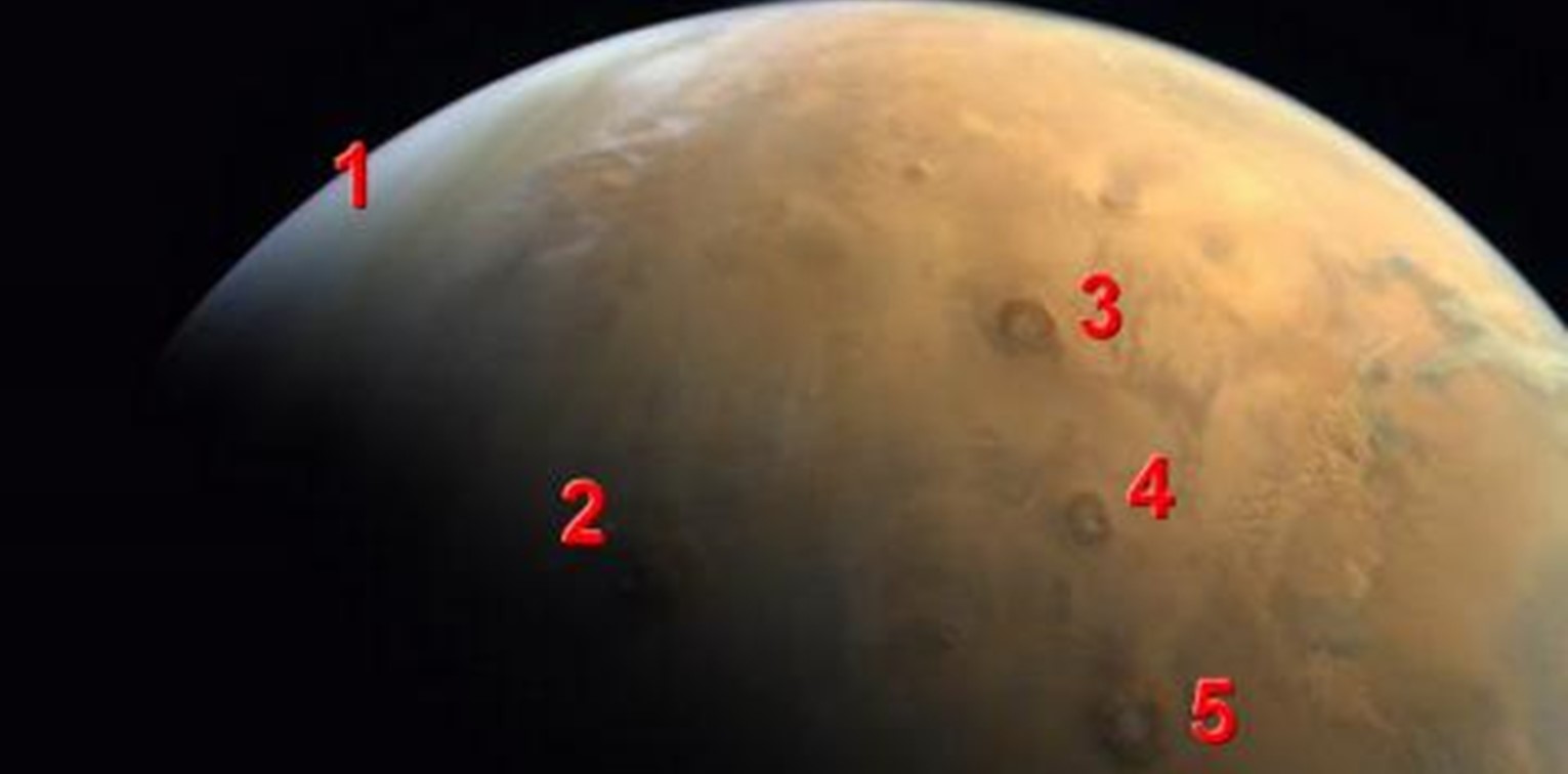En la esquina superior izquierda podemos ver el polo norte marciano, cubierto de hielo (1). En pleno amanecer, en el centro del planeta, asomándose con sus 22.500 metros de altura y sus 610 Kilómetros de longitud, está el volcán más alto del Sistema Solar, el Monte Olimpo (2).